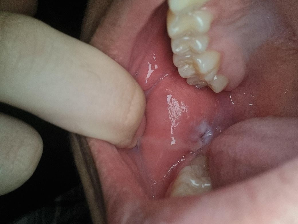 사진으로 봤을 경우에는 잇몸이 외부 자극으로 인해서 눌린 것으로 보입니다. 보통 반대쪽 지아가 잇몸을 누르면서 생기는 증상일 수 있습니다. 이런 경우 잇몸을 누르는 부분을 다듬어주면 없어지는 경우도 있습니다.