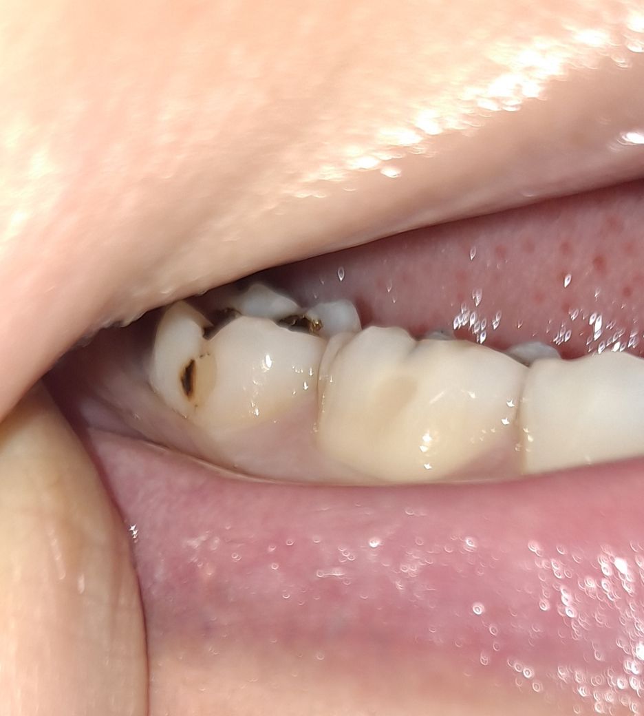 사진으로만 봤을 경우에는 충치가 생긴 것으로 보입니다. 레진 수복물 주변에 충치가 생길 수 있었을 수 있으니 충치라고 한다면 치료를 해주는 것이 좋습니다. 자세한 확인을 위해서 치과에서 진료를 받아보는 것을 권유드립니다.