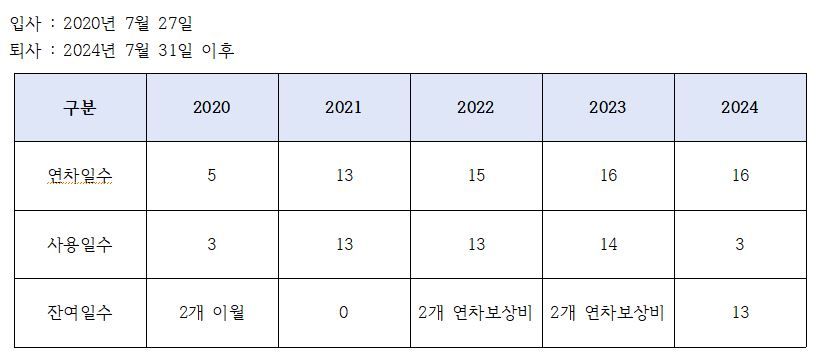 2020년 7월 27일 입사하였고 2024년 7월 31일 까지 휴가를 쓰고 퇴사하고자 하는데