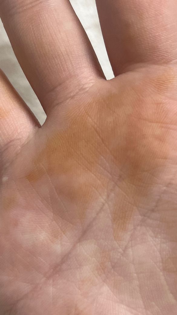 귤도 안 먹었고 갑자기 폰 보고 있었는데 오른쪽 손만 노랗게? 물들었어요 손등은 멀쩡한데 손바닥이랑 손톱 끝쪽이 노래요..무슨 병일까요? 손 씻어봤는데 안 없어져요