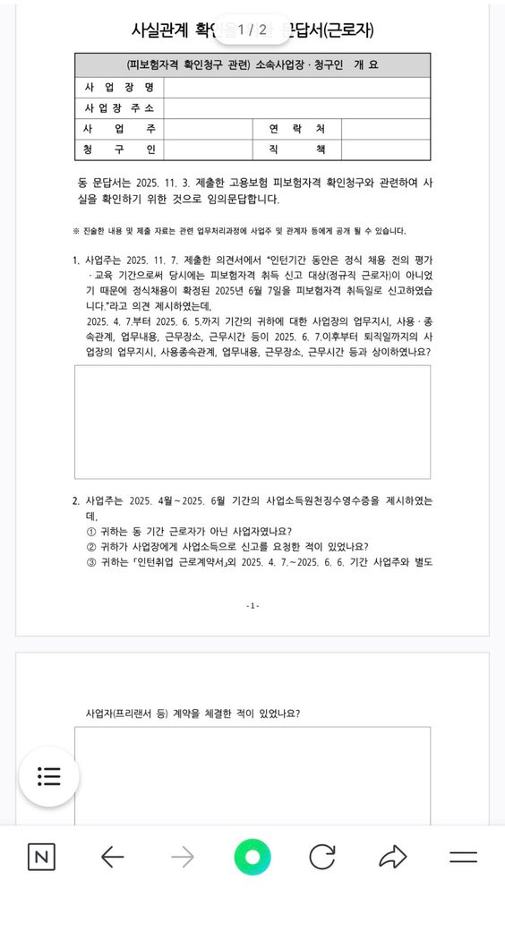 공단에서 회사로 연락하니 사측은 “인턴기간 동안은 정식 채용 전의 평가•교육 기간으로써 당시에는 피보험자격 취득 신고 대상(정규직 근로자)이 아니었기 때문에 정식채용이 확정된 2025년 6월 7일을 피보험자격 취득일로 신고하였습니다."라고 주장하였다고 해서 아래 첨부한 사진처럼 문답서를 작성해야 되는 상황인데요.
