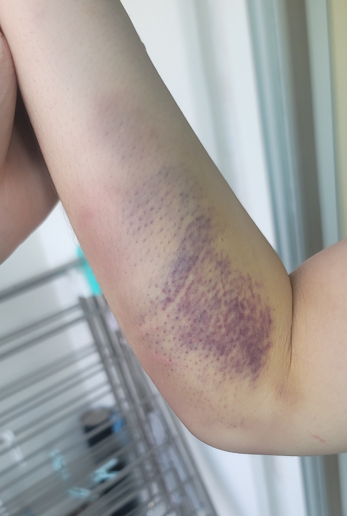 5일전 동네병원 건강검진을 위해 채혈을 했습니다. 임상병리학 쪽에서 채혈을 했는데 계속 멍이 퍼지고 있습니다. 눌렀을때 아프고 근육통은 없습니다. 멍이 계속퍼지는데 괜찮은건가요?
