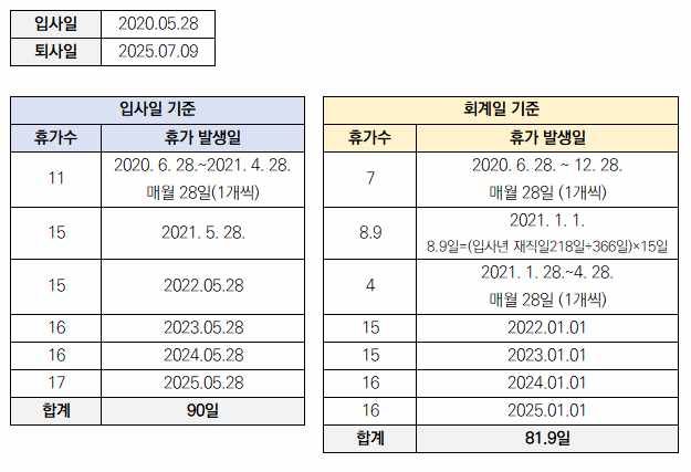 계산기로 계산했을 때 입사일 기준 연차 총 90일, 회계일 기준 총 81.9일이 나왔는데 그럼 차이가 8.1일인데 이렇게 많이 차이가 나는게 맞는건가요? 이렇게 큰 차이의 이유가 궁금합니다.