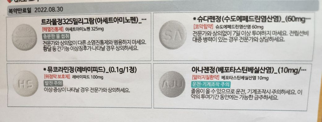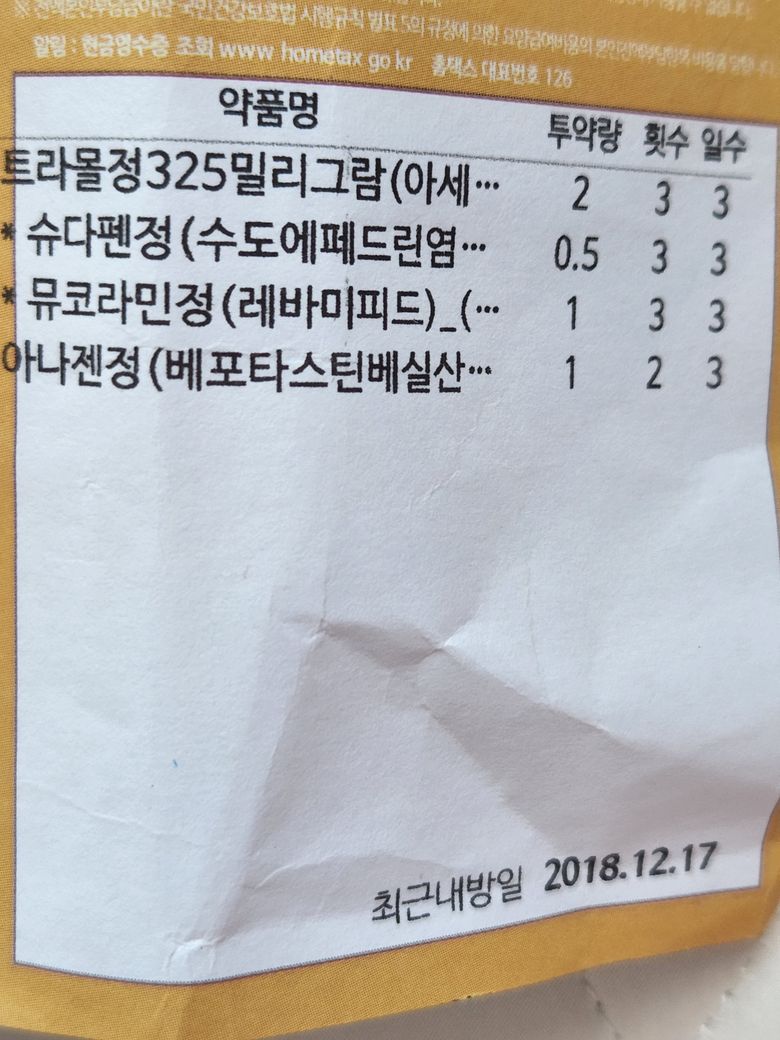 트라몰 / 슈다펜 / 뮤코라민 / 아나젠을 복용하셔도 됩니다.