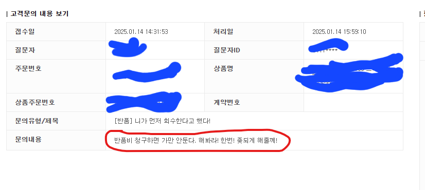 14일(화) 네이버 메신져를 통해 욕설 및 억치스러운 일방적인 주장만 하시길래 더이상 대화는 진행하지 않겠다하고 말씀드리며 반품 및 회수 진행 하겠습니다. 라고 전달 후 회수 진행하라는 답변을 받고 반품 처리 완료했습니다.