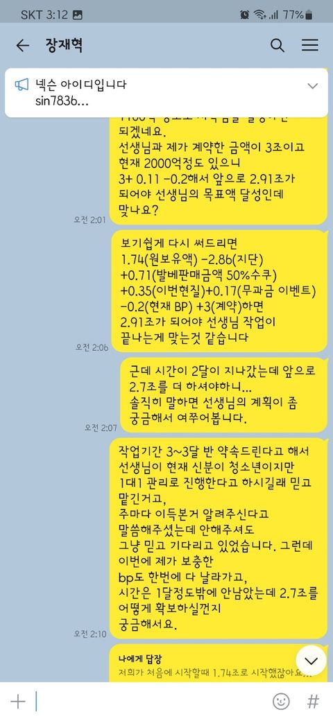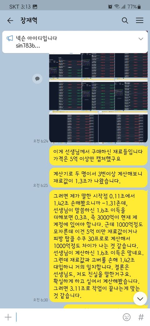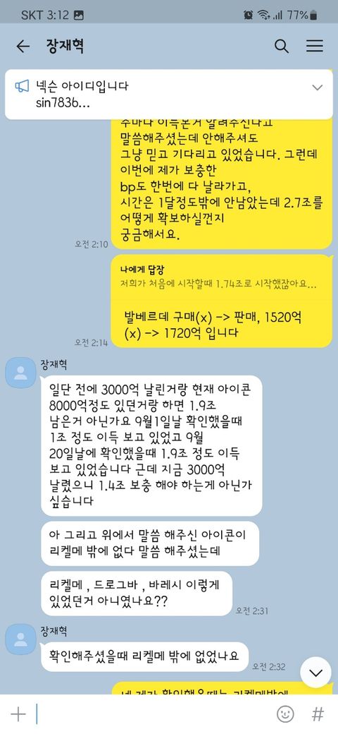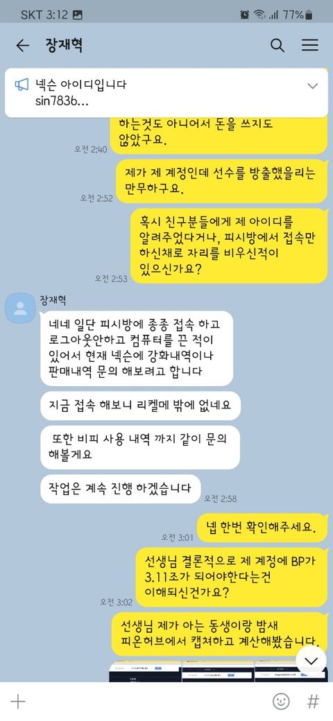 6. 제가 작업자에게 신뢰가 무너져서 거짓말 하는 사람이라는 거래 못하겠다고 하고, 약속한 3조 BP중 거의 아무 수익을 내지