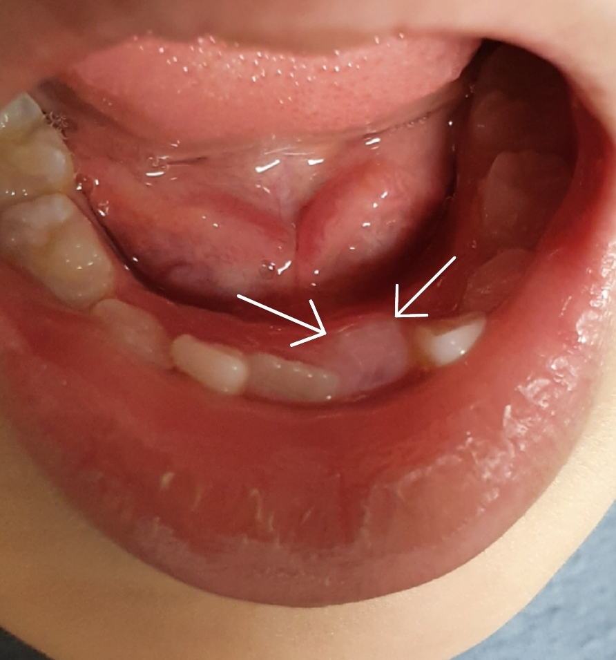 아래 앞니의 경우에는 설측에서 맹출이 되는 경우가 있습니다.