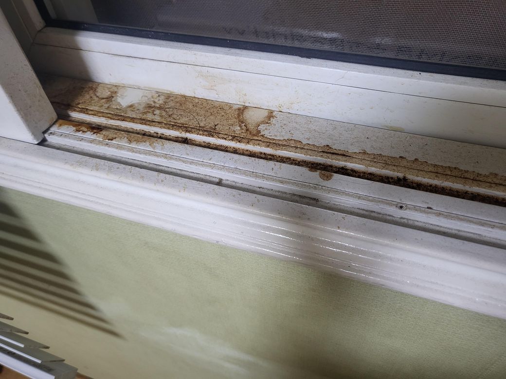 창문 옆에 있었는데 뭔가 창문 위에서부터 물이 툭툭 떨어지길래 봤더니 창문 상태가 저렇습니다.