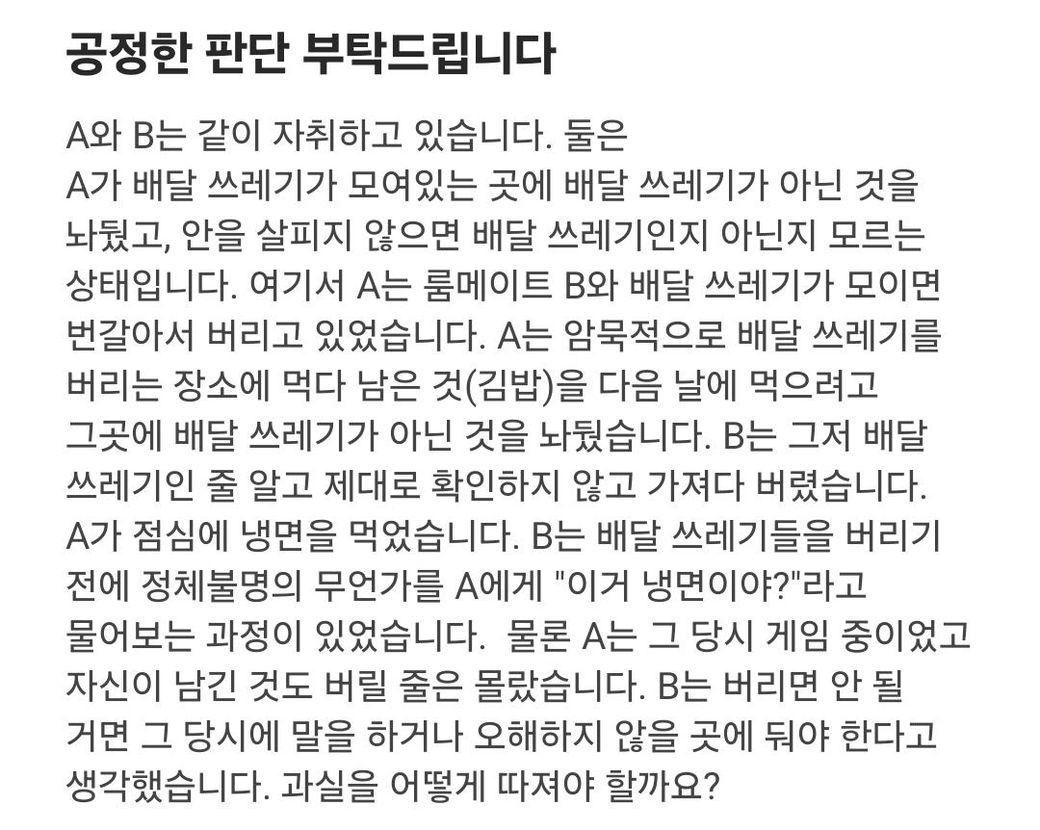 B가 외출 전에 배달 쓰레기를 들고 가져다 버리는 일반적이고 예상 가능한 행위 중이었고 A는 게임중이라 몰랐답니다