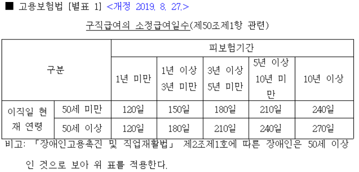 구직급여는 소정급여일수에 대하여 지급하는 바, 소정급여일수는 다음과 같이 이직 당시의 연령 및 피보험기간에 따라 차등하여 부여됩니다.