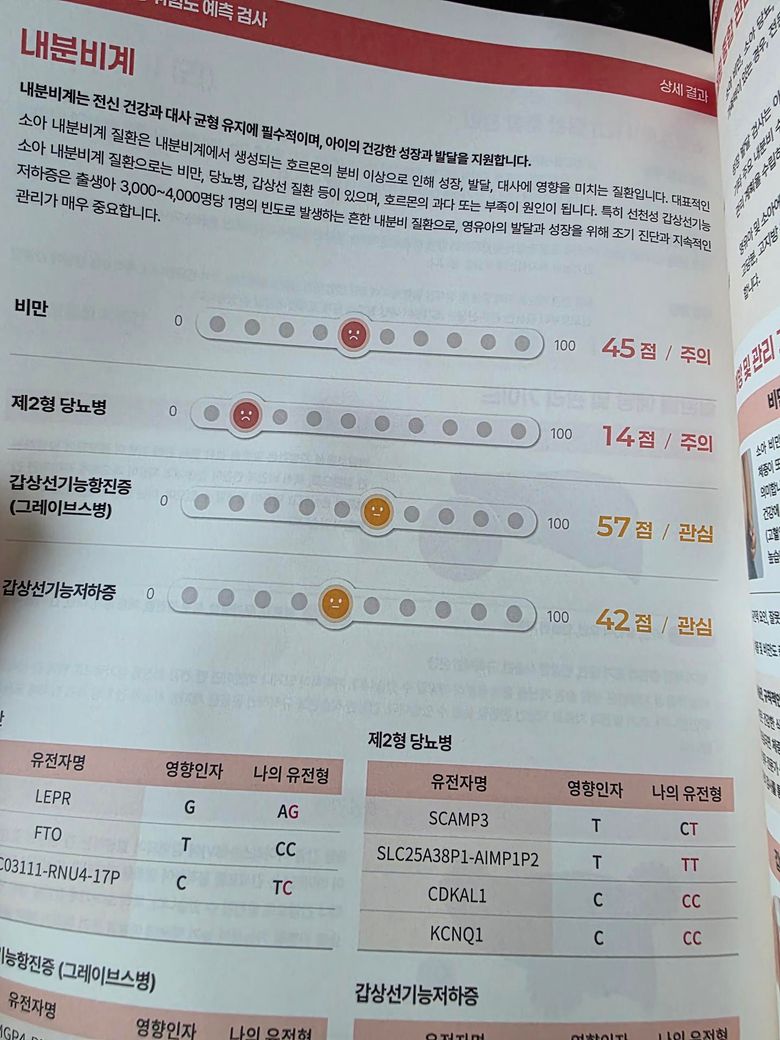 지스캐닝 소아 유전적 질병 위험도 예측 검사에서 adcd가 100점중에 69점으로 관심 결과가 나오고 제2당뇨병이 100점중에 14점으로 주의가 나왔어요 당뇨는 가족력이 있어서 그런거 같은데 인슐린 분비가 잘 안되서 저렇게 나온걸까요? 확진검사는 아니죠? 여기서 위험하게 나왔다고 2형당뇨병에 걸리는건 아니겠죠? ㅜㅜㅜ 태어날때부터 인슐린 분비가 적게 되는 아기인건가요?걱정되네요..