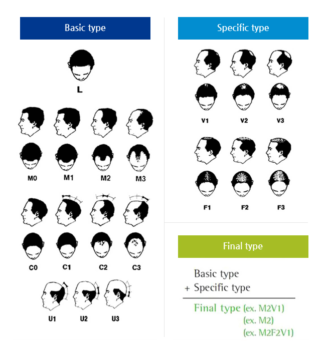 유전형 탈모인 남성형탈모 (안드로겐성탈모)는 남성형 탈모증은 정수리와 이마 부분의 머리카락이 얇아지고 빠지는 특징적인 양상을 나타내는 반면, 옆구리와 뒤통수의 머리카락은 대체로 그대로 유지되는 탈모의 형태를 보입니다. 이러한 현상은 50세 이상 남성 인구의 대략 절반에게서 나타나며, 보통은 30대나 40대에 발생하기 시작하지만, 드물게는 사춘기 이전이나 이후에 조기에 시작되는 경우도 있습니다. 남성형 탈모의 진행 정도를 구분하기 위한 분류법으로는 앞머리의 후퇴 정도를 나타내는 기본 유형과, 정수리 부위의 탈모 정도를 보여주는 특정 유형, 그리고 이 두 가지를 결합한 최종 유형으로 세분화되어 있습니다. 이러한 분류는 탈모의 진단과 치료 계획을 세우는 데에 중요한 정보를 제공하며, 각 개인의 탈모 상태를 세밀하게 파악할 수 있게 도와줍니다.