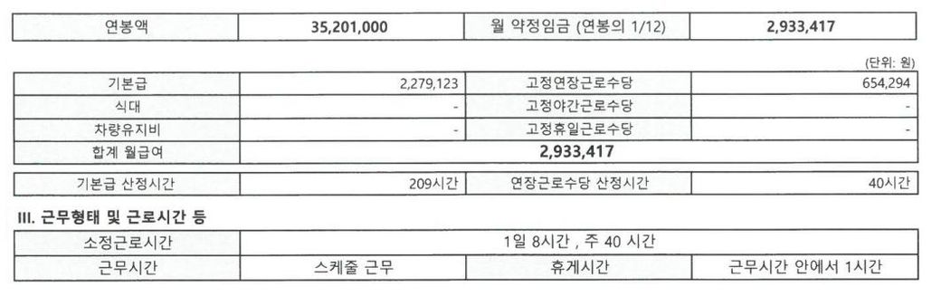 그래서 위 근로계약서상 저 '고정연장근로수당' 40시간 - 654,294 원을 변경을 해야 될 것 같은데
