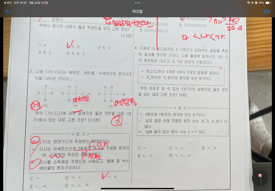 문제 4번에서 탄소(C) 원자4개와 X 원자 3개의 질량이 같으며, X₂ 분자와 Y₂ 분자량의 비율이 8:7이라는 정보를 바탕으로 1g당 원자 수를 계산하는 방법을 설명하겠습니다 :