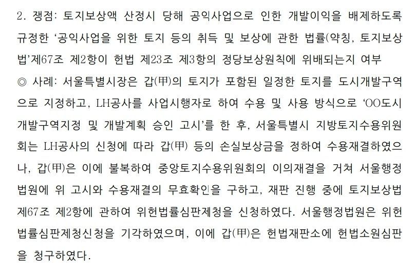 따라서 개발이익은 그 성질상 완전보상의 범위에 포함되는 피수용자의 손실이라고 볼 수 없으므로, 이러한 개발이익을 배제하고 손실보상액을 산정한다 하여 헌법이 규정한 정당한 보상의 원칙에 위반되지 않는다.