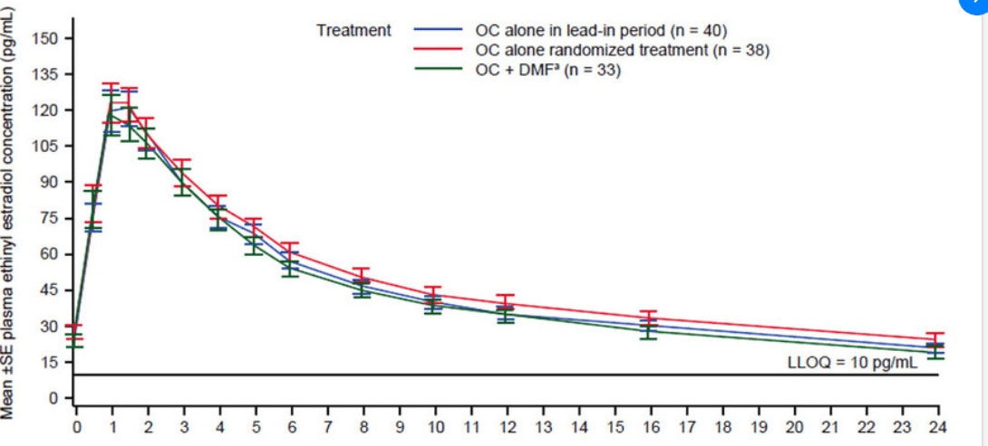 위의 그림은 야즈정의 성분중 에틸에스트라디올의 체내농도를 나타낸것입니다.