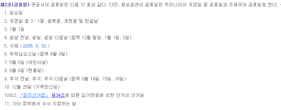 관공서 공휴일에 관한 규정에서 공휴일 내용 확인 가능합니다.