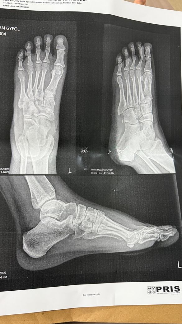 계단에서 넘어져서 발목 인대를 다쳤는데 제가 해외에 있어서 제대로 진료를 못 받고 깁스를 착용중입니다. 5일 지났는데 발목부터 발가락까지 멍이 들었고 아직 붓기가 심합니다. 해외 병원에서는 그냥 발목 인대가 늘어난거라고 하는데 상태가 너무 안좋아서 혹시 인대가 파열된건지 걱정이 됩니다.알 수 있을까요? X-ray 사진 첨부합니다.