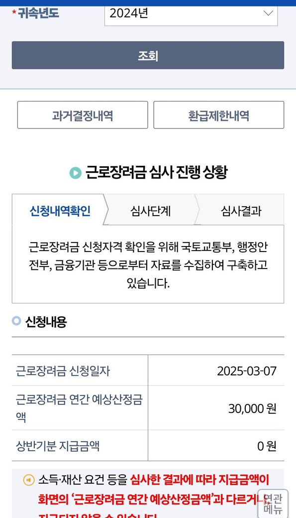 근로장려금을 2025년 3월 7일에 신청을 하였는데요 그... 저번에는 711,000원으로 되있었는데 3만원으로 바뀌었는데 3만원 받는건가요..?? 흠...