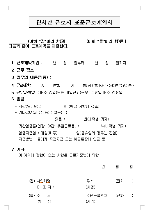 2. 단시간 근로자라고 하여 별도의 법정 양식이 있는 것은 아닙니다. 근로시간에 관한 내용이 적혀 있고, 단시간근로자임을 확인하는 내용만 들어가면 되는 것입니다.