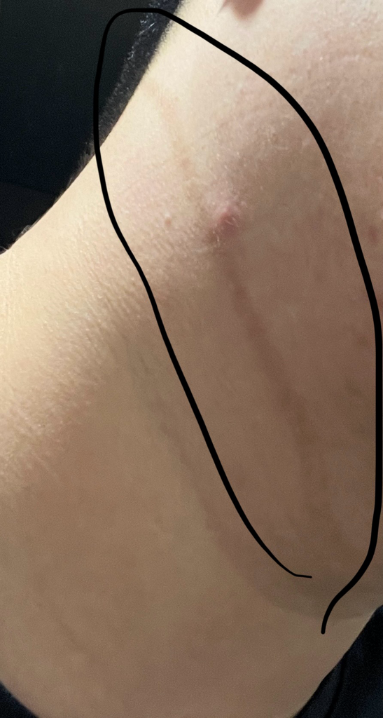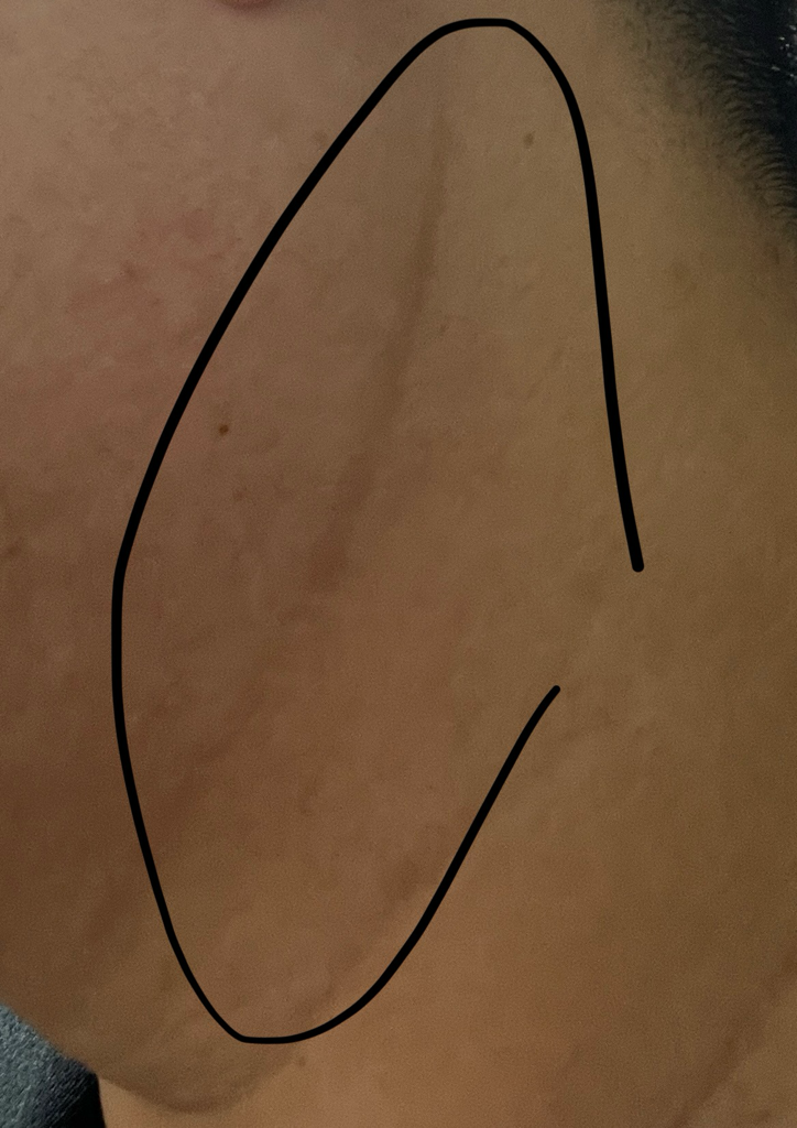 흉터 치료가 필요할 것 같습니다. 상처가 발생한지 3-4개월이 지난 상황이니 흉터연고는 효과가 없을 것으로 보이고, 피부과에서 상담을 받아보시는게 좋겠습니다.