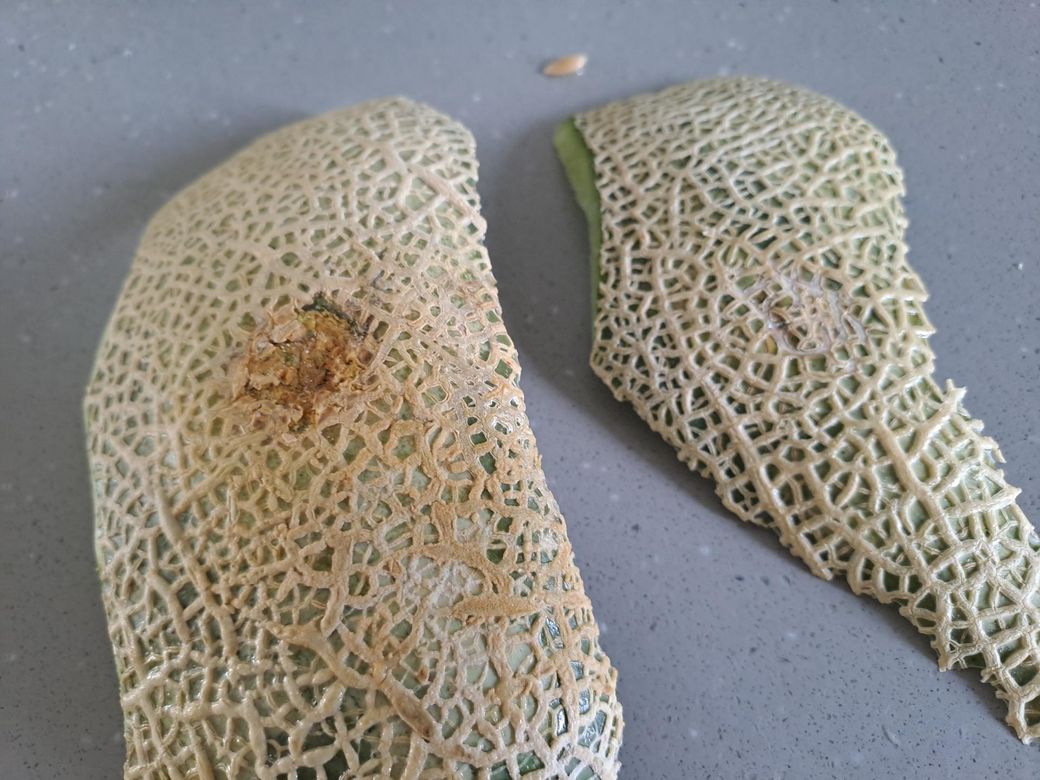 멜론이 자라는 과정이나 수확/운송 중에 충격을 받아 해당 부위 세포가 손상되어 갈변과 쓴맛이 생깁니다.