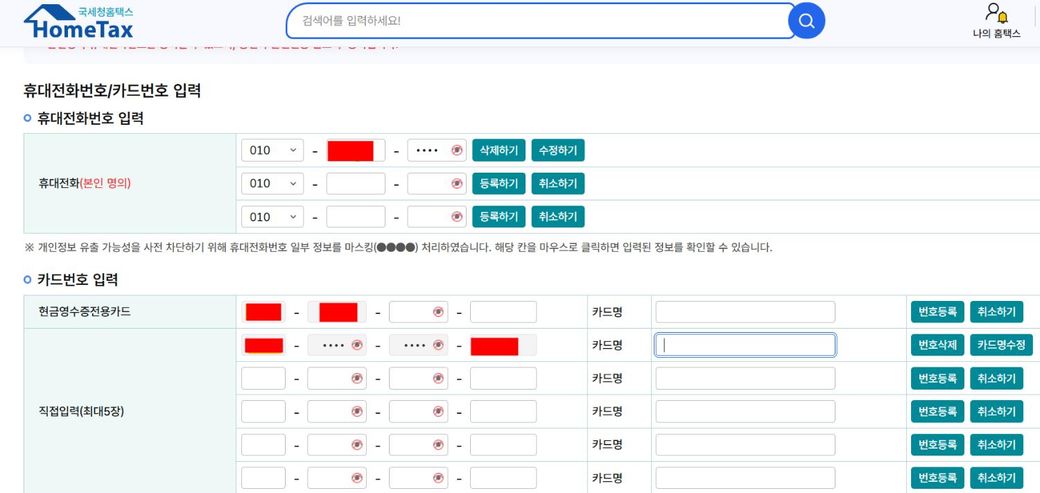 근데 알고보니 국세청 홈페이지 [밑 사진 참고] 란에 휴대전화번호, 카드번호 입력