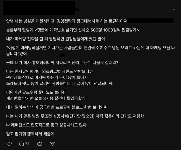 마케팅 일환으로 '1000원'을 그냥 주는 이벤트를 하는 사람이 있었는데요. 댓글로 계좌번호를 적을 시에 1000원을 주는 이벤트를 한다고 하였습니다. 근데 제가 생각하기에는 댓글로 계좌번호를 오픈하는건 개인정보보호법 제위반으로 보여지는데요.