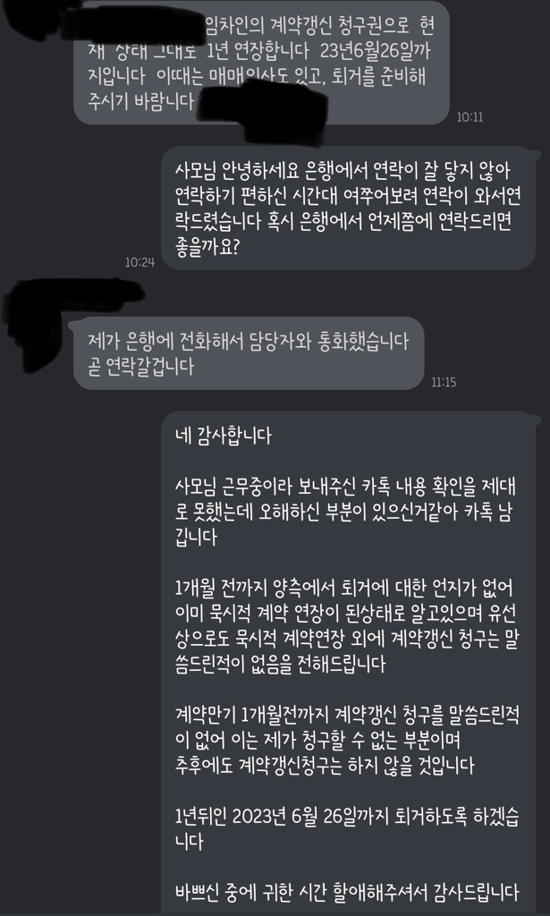 (카톡 내용중 계약갱신 청구권 얘기가 있으나 이건 당시 상황상 해당되지 않는, 집주인이 잘못 알고있는 내용이었고 오늘 통화시 서로 묵시연장으로 인지하고 있음을 확인했습니다