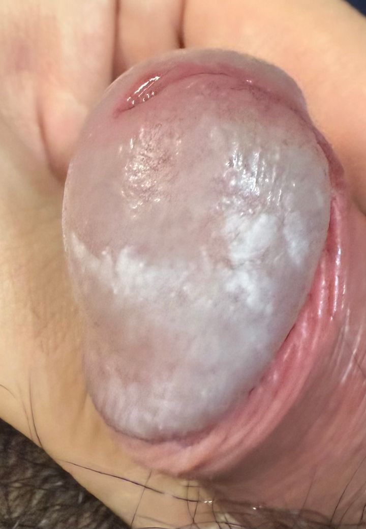 사진상 귀두 표면에 넓게 퍼진 흰색 막처럼 보이는 병변이 관찰되며, 형태상 돌출된 사마귀나 뚜렷한 궤양보다는 표면이 하얗게 변색된 양상입니다. 포피를 젖힐 때 따가움이 동반된다는 점을 고려하면 가장 흔한 원인은 칸디다성 귀두염(곰팡이 감염)이며, 그 다음으로는 세정제나 마찰 등에 의한 자극성 귀두염 가능성이 있습니다. 전형적인 성병 병변 형태와는 다소 거리가 있으나, 완전히 배제할 수는 없습니다.