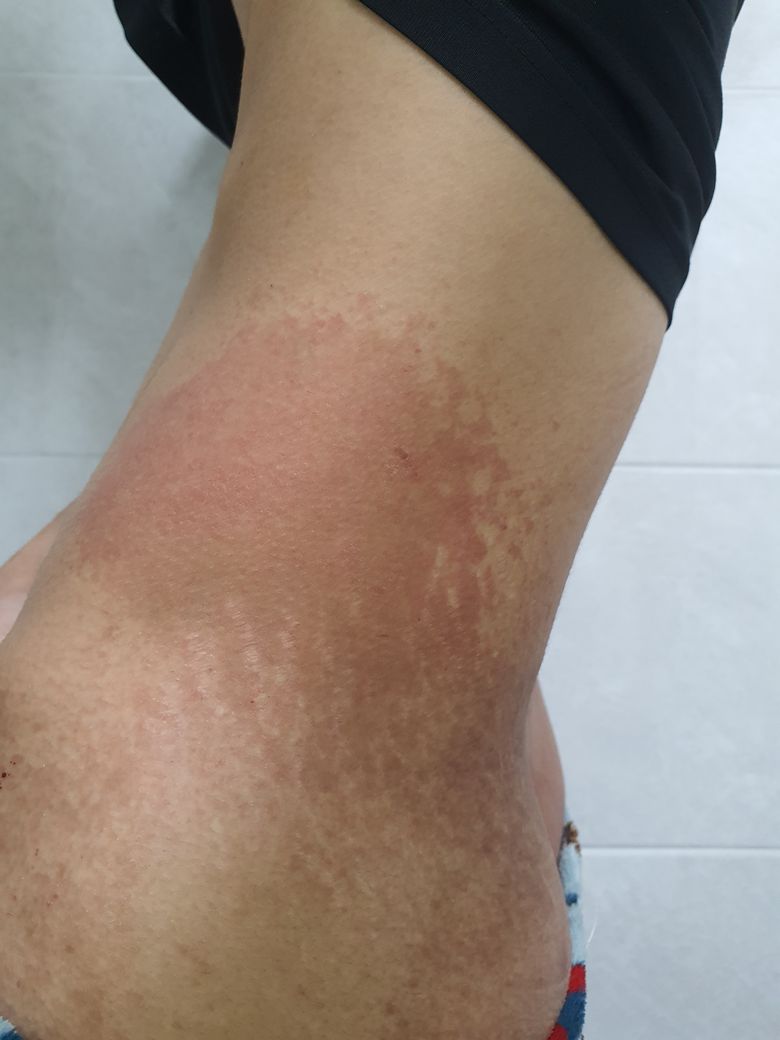 피부에 광범위한 발진과 붉은 색조가 나타나 있고, 패턴이 불규칙적인 경계를 가진 것으로 보입니다. 가려움증을 동반한 이러한 증상은 다양한 피부 질환에서 발생할 수 있으며, 아토피 피부염, 접촉성 피부염, 건선, 피부 진균증 또는 다른 형태의 염증성 피부 질환일 수 있습니다.