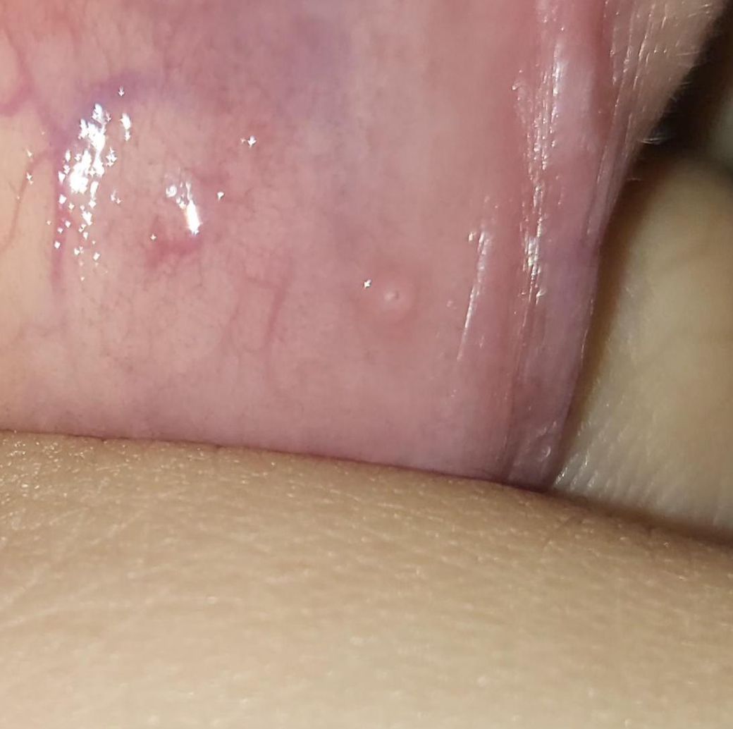 아랫입술 안쪽 점막에 전반적으로 수포가 생겼어요 통증은 아예 없고 약간 단단한 느낌입니다 맨 오른쪽 사진만 눈에 띄게 크고 나머지는 잘 안 보이게 작아요 헤르페스인가요?