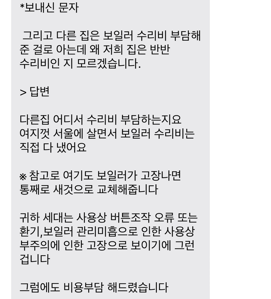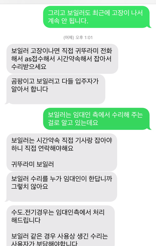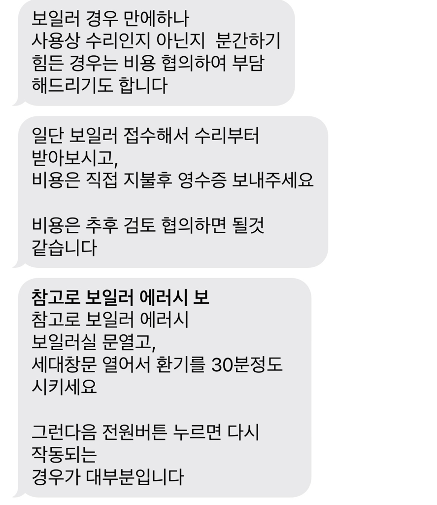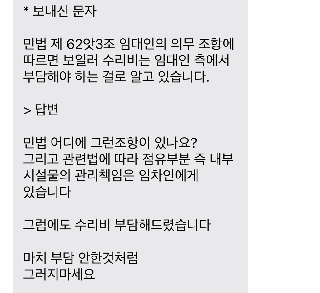 임대인은 보수의무를 부담하고 있기 때문이 보일러 고장이 임차인의 과실로 발생한 경우가 아닌한 임대인이 전액 부담해야 하며, 기재내용상 임차인의 과실이 있다는 부분이 없어 보여 민사소송절차 진행이 가능할 것으로 보입니다.