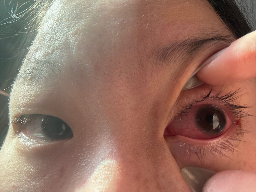 사진상 결막(흰자) 충혈이 비교적 뚜렷하고, 일주일 이상 통증과 눈물이 지속된 점을 보면 단순 일시적 자극보다는 염증성 질환 가능성이 높습니다. 특히 콘택트렌즈 사용력이 있는 경우 각막까지 침범한 상태를 반드시 배제해야 합니다.