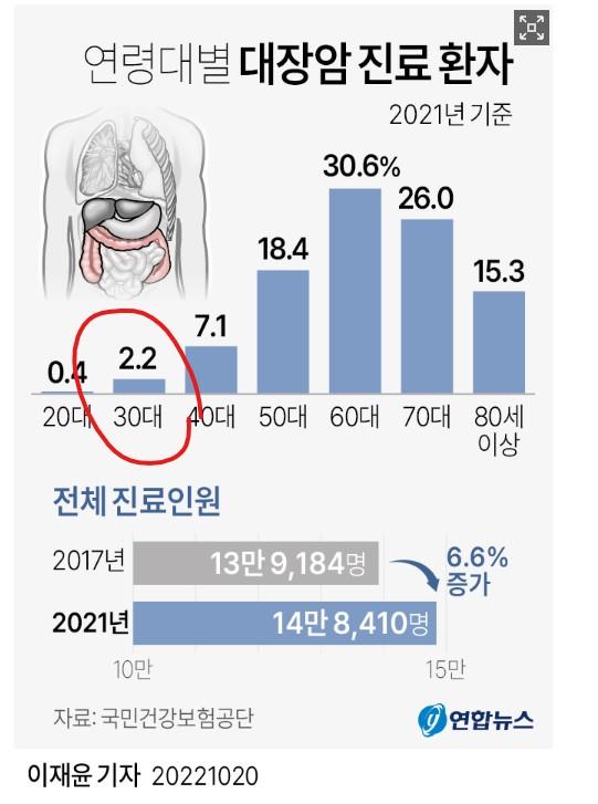 또한 연령별대장암발생률을 살펴보면 환자분 연령에서 대장암이 상당히 드물다는 것을 확인이 가능할 것입니다.
