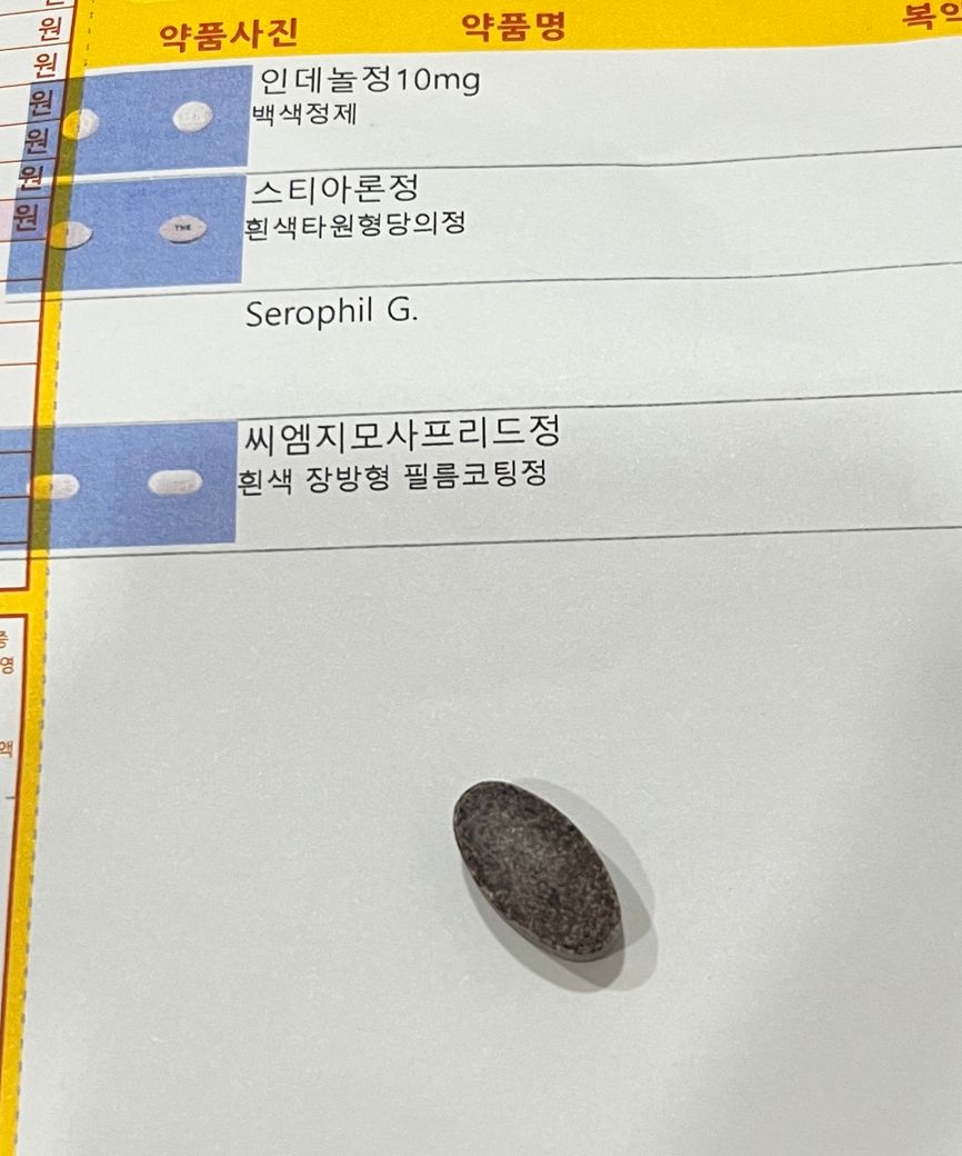 아마 올려주신 정제실물의 약이름이 뭔지 궁금하신 것 같습니다. 저 약이 serophil G일 것 같은데요. 의약품은 아니라서 검색이 따로 되지 않습니다. 건식같은것일텐데 구글링을 해봐도 딱히 뭔지 나오지가 않네요. 이건 그 약국이나 병원에 문의를 직접하시는게 맞겠습니다.