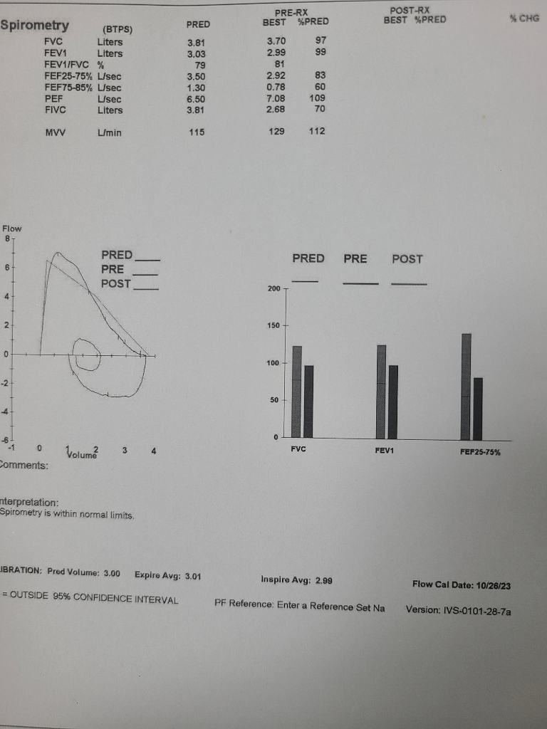 폐기능검사결과지의 FEV1/FVC 가 70% 이하여야 폐쇄성 장애 (천식등) 을 의심할수 있는데 질문자분은 80% 정도 됩니다. 그외에 FEV1, FVC 도 정상으로 확인되고 있습니다.