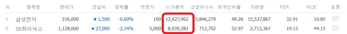 결론적으로 주식시장에서 기업의 시가총액는 삼성전자의 시총은 1260조, 하이닉스는 800조로, 대략 1.6배 정도 삼성전자가 큽니다.