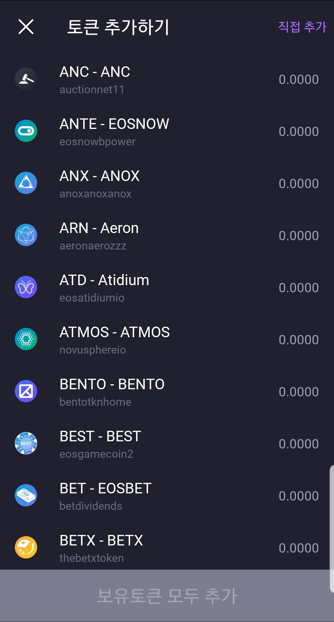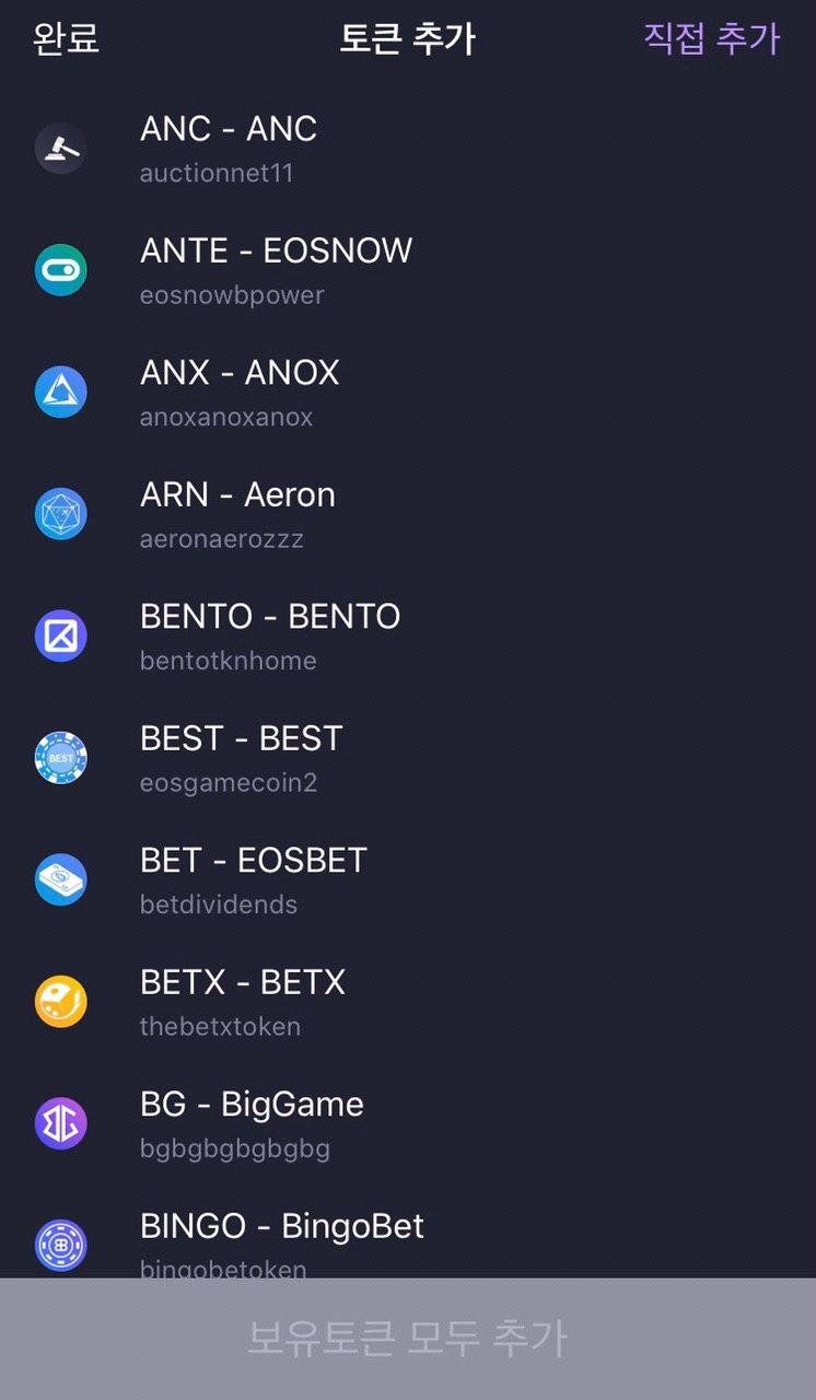 그러면 아래 같은 화면이 나옵니다. 아래보이는 화면에 보유토큰 모두추가 버튼을 누르거나 또는 직접추가를 눌러서 해당토큰 컨트랙트 주소를 수동으로 입력하는 방법이 있습니다.