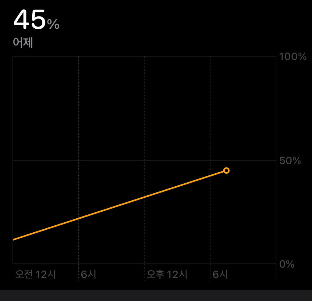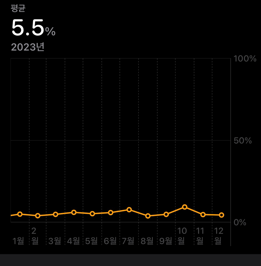 평소 다니는 길이 언덕이고 핸드폰은 주로 들고 다니는데 그래서 측정이 제대로 안된걸까요? 평균치로 보면 모르겠는데 단위를 바꾸면 45퍼센트 막 이렇게 뜨니까 놀랐네요.. 딱히 걸어다니지 않은 것 같은 시간대에서 높게 뜨니까 좀 이상한 것 같긴한데..