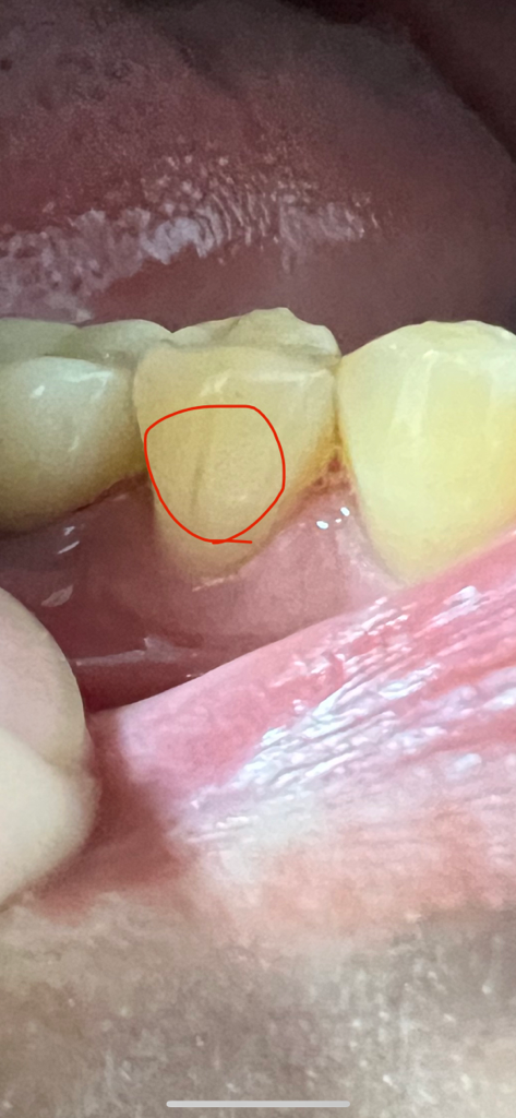 실금일 가능성이 있어 보이나 해당 부위 정도라면 파절 되었을 가능성이 있습니다. 즉 단차가 느껴지지 않더라도 내부에서 금이 간 경우도 있을 수 있습니다. 보통 증상 초기에는 통증이나 불편감이 나타나지 않을 수 있으니 주기적으로 치과 방문 후 검진을 하거나 dental-CT 등을 찍어보는 것을 권해드립니다.