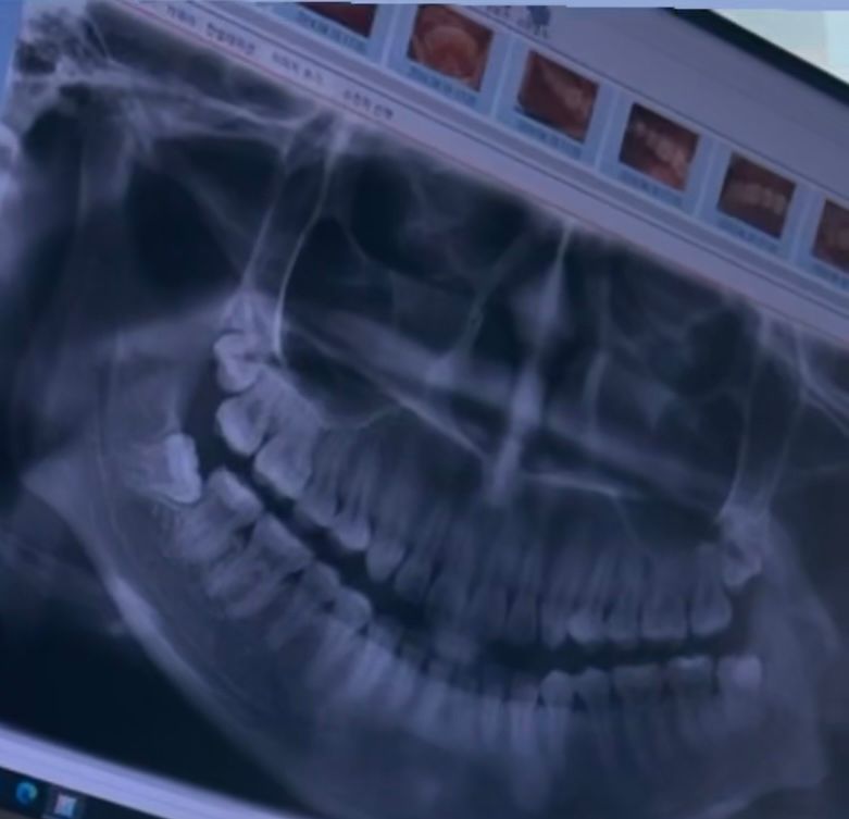 오른쪽 사랑니가 파노라마 방사선 사진 상에선 왼쪽입니다 해당 사랑니는 뼈에 파묻혀 있기 때문에 빼고자 할 때 잇몸뼈를 조금 제거해야 한다는 점은 알고 계셔야 합니다
