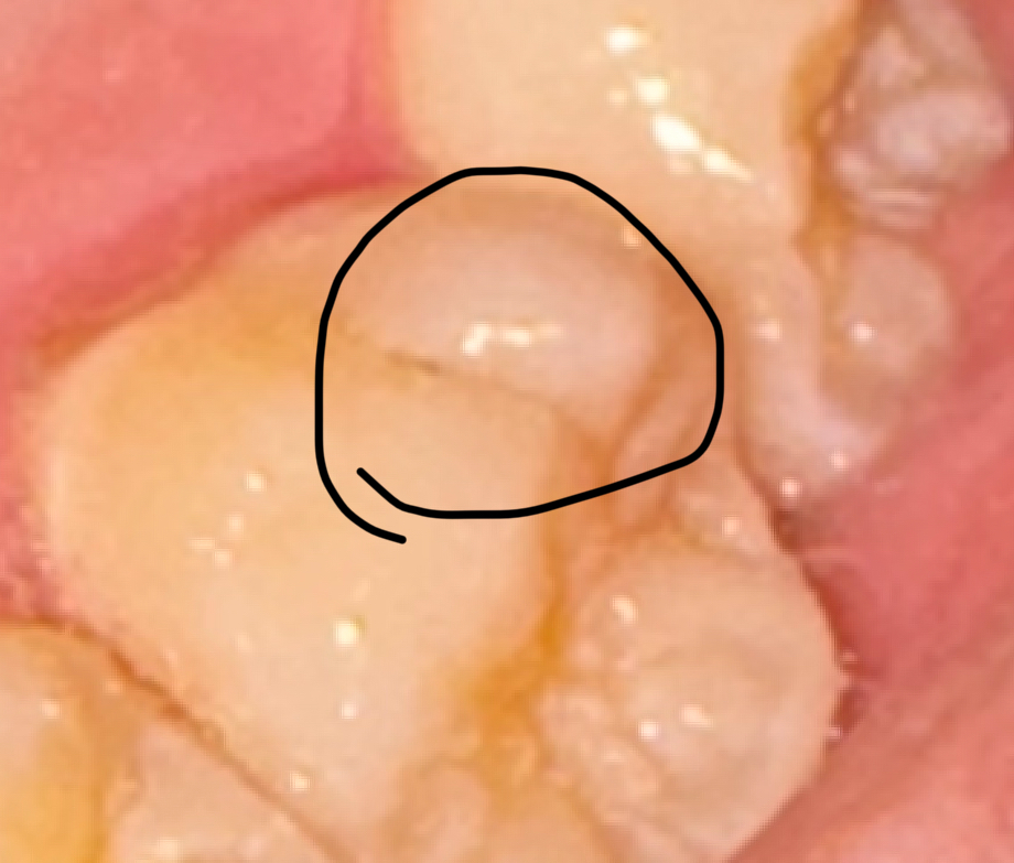 사진을 보면 다른 치아는 다 노란빛이 도는데 동그라미 친 부분만 하얀듯한 느낌이 드는데요