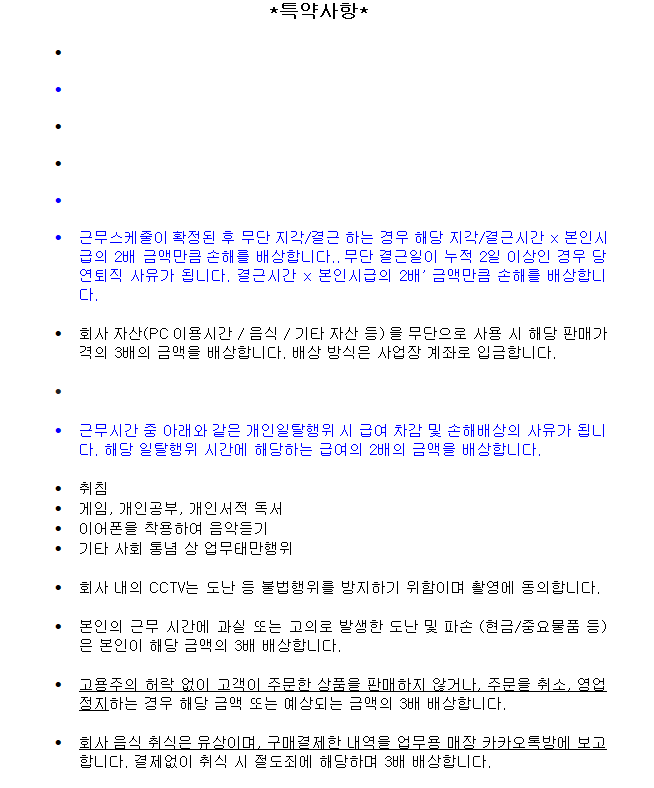 하나 더 질문할 것은 근로계약서의 무효여부인데요, 배상에 대한 조항이 많아 이상하게 느껴져