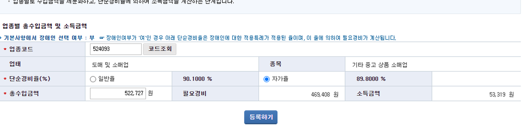 해당 소득금액은 업종별로 산정된 단순경비율로 계산한 내역입니다.