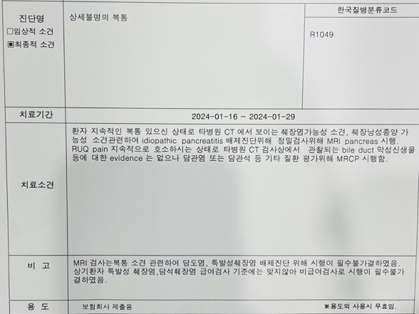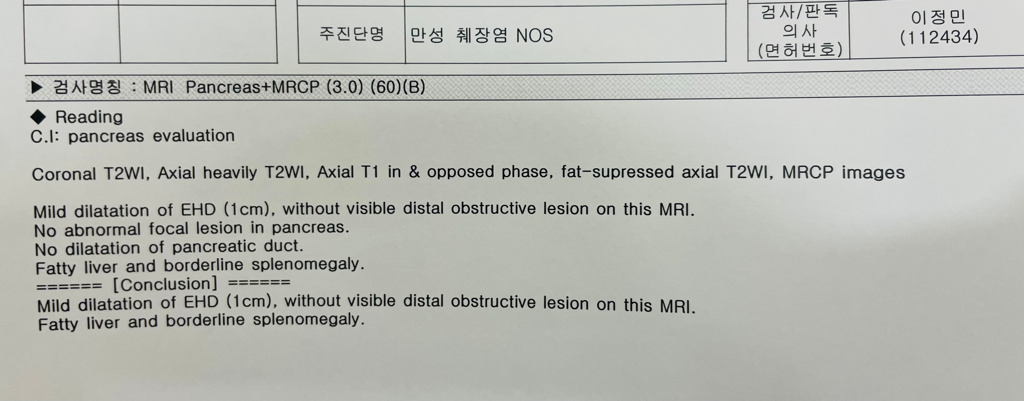 이러한 MRI 소견을 토대로, 췌장은 정상이나 간외 담관의 확장이 관찰된다고 결론내릴 수 있습니다. 정기적으로 영상촬영을 통해 변화가 나타나는지 정도만 확인하시면 되겠고, 지방간이 있으니 식단조절 및 운동을 통해 체중감량하시고 절주하시려는 노력이 필요합니다.