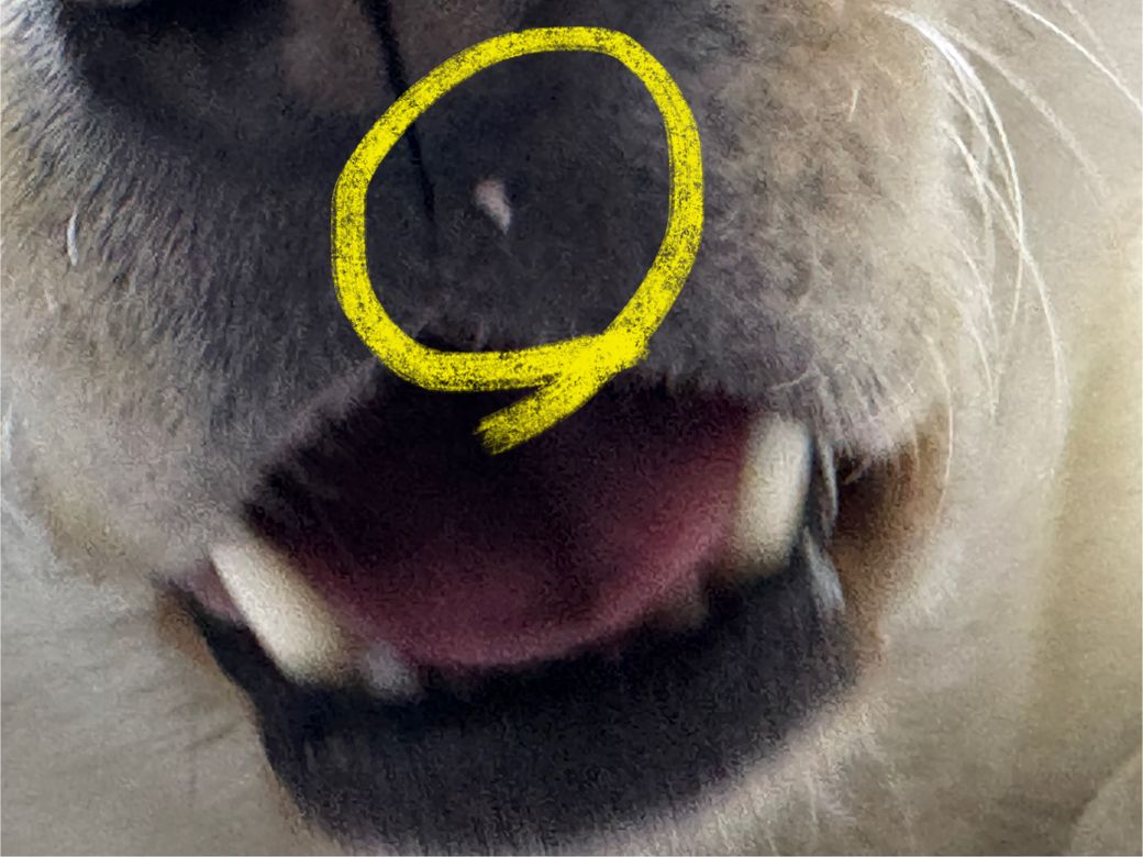 중의 하나로 여깁니다. 사진상으로는 2와 4의 가능성은 낮아 보이나 1과 3은 구분할 수 없습니다. 위치가 나빠서 조기에 진단 치료하는게 추천되는 위치이니 동물병원에 데려가서 진료 받아 보시기 바랍니다.