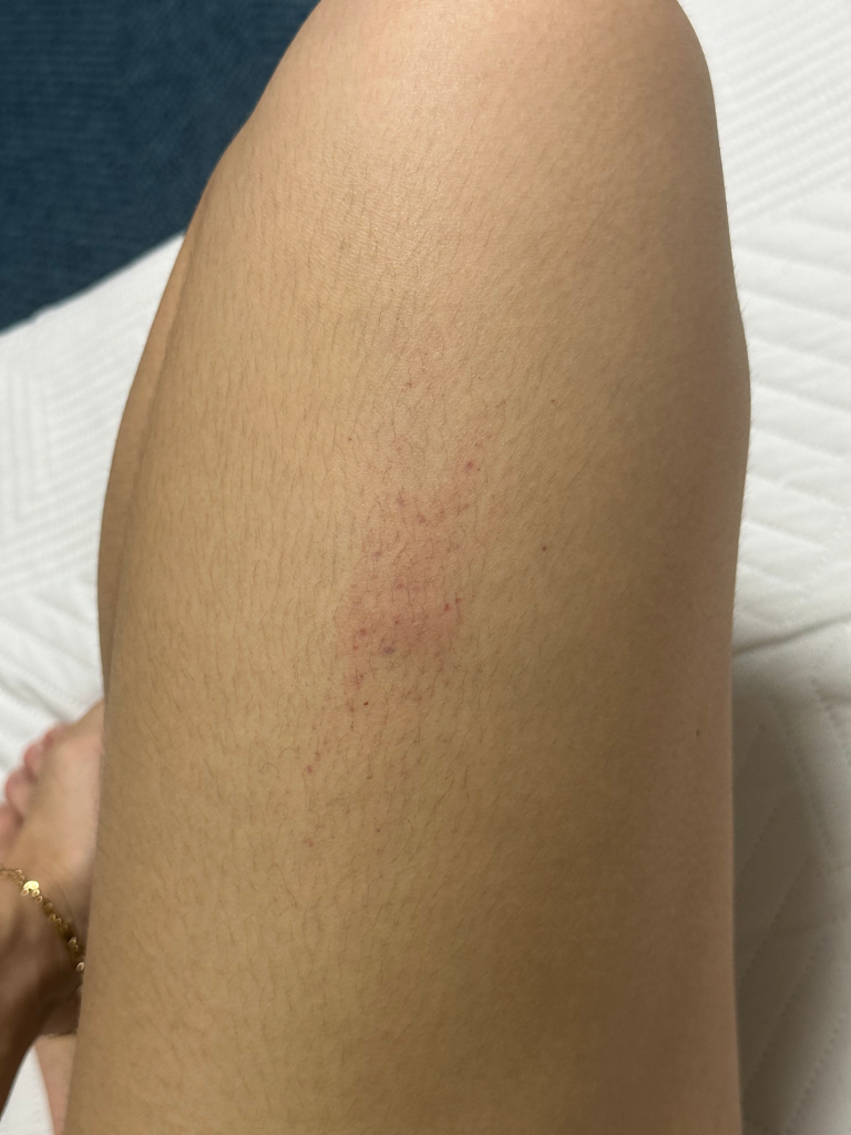 등산을 다녀온 뒤 허벅지에 발생한 피부병변에 대해 고민스러우시군요. 마찰에 의해 발생한 피부염이 의심됩니다. 불편한 증상은 없고 피부의 변화만 유발한 상황이라면 보습을 충분히 하면서 기다려보실수 있겠습니다. 다른 증상으로 고민스러우신 경우에 피부과를 방문해보시는 것을 권해드립니다.