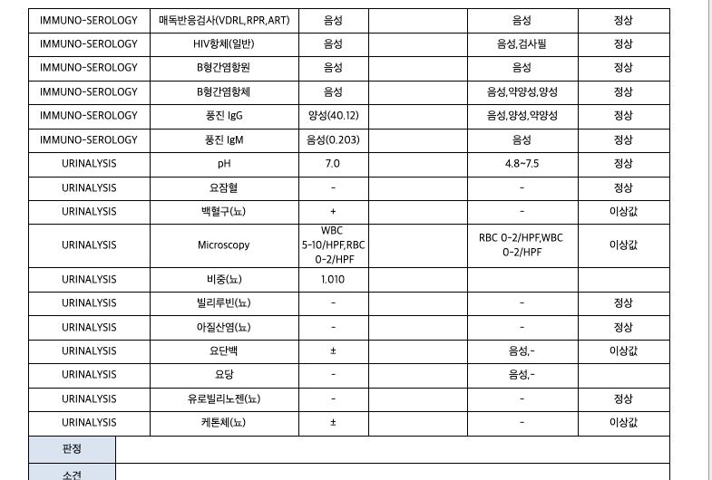 microscopy (결과) WBC 5-10 * HPF, RBC 0-2 * HPF / (정상값) RBC 0-2 / HPF,WBC 0-2 / HPF / (판정) 이상값