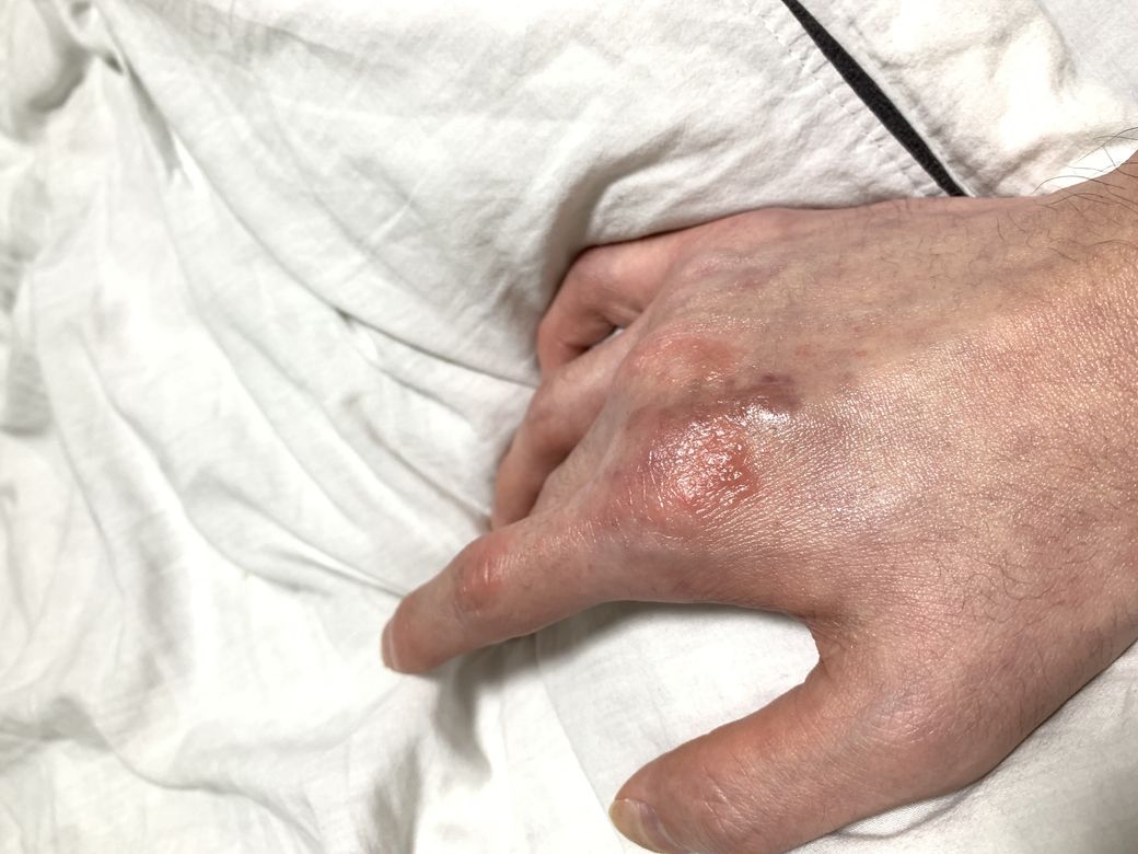 손가락 수술 부위에 알레르기 피부염이 발생하는 것으로 보이며 알레르기를 유발하는
